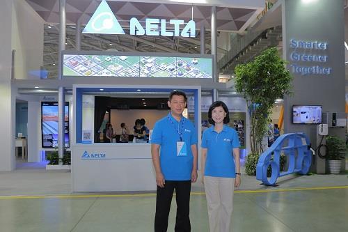 Delta CEO Ping Cheng (left) and CBO Shan-Shan Guo in front of Delta’s “Smart Green Building” pavilion