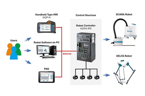 Delta’s 5-axis SCARA solution can execute angled pick-and-place and 3D dispensing applications that would normally require a more expensive 6-axis articulated vertical arm robot.