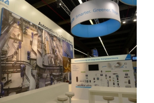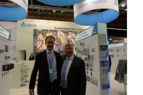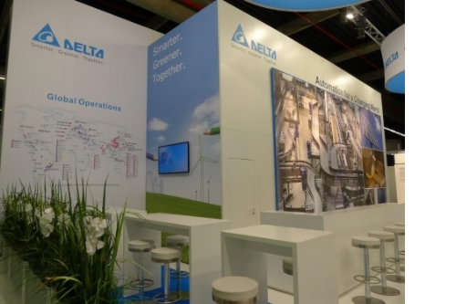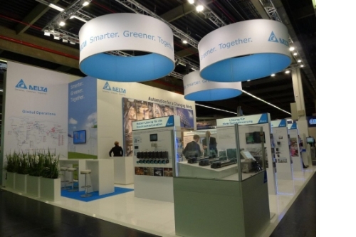 The Delta Industrial Automation booth conveys a vivid Delta brand image.