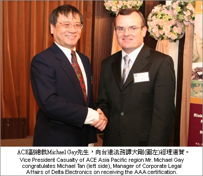 Delta Obtains ACE "Product Liability Insurance AAA Certification" The only company in Taiwan certified for the highest product liability rating