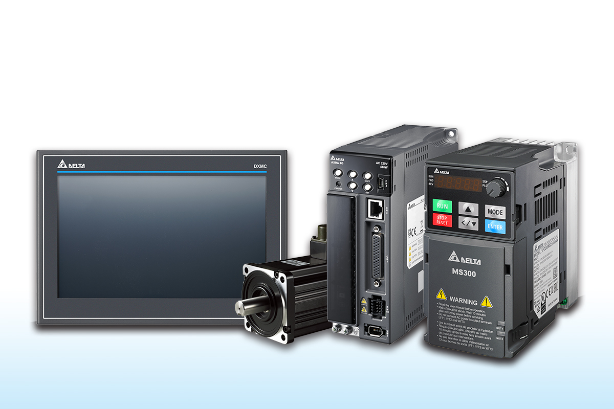 Delta’s Cellophane Packaging Machine Solution applies the Extended Motion Controller DXMC-P Series (left) to combine info displaying and motion controlling into one. It is equipped with the Standard Compact Drive MS300 Series (right), the AC Servo Drive ASDA-B3-E Series (second from right), and the Servo Motor ECMA Series (second from left), with EtherCAT bus transmission to satisfy the need for both speed and precision.