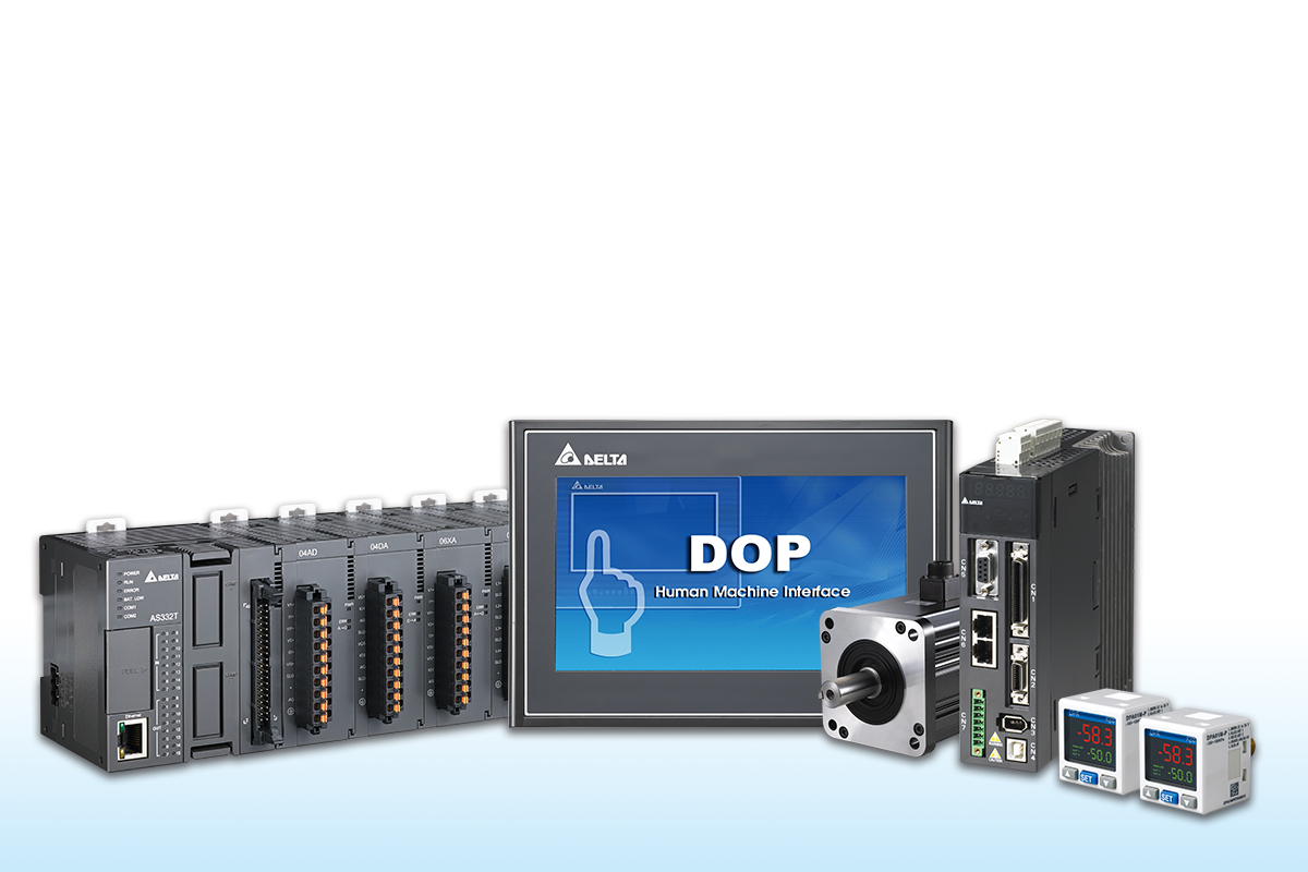 Delta’s Airtightness Test System Solution employs the Compact Modular Mid-range PLC AS300 Series (left), AC Servo Drive System ASDA-A2 Series (second from right), and Standard Multifunction Pressure Sensor DPA Series (right) to carry out precise motion control, efficient airtightness tests, and save power in the meantime. On the other hand, operators can have full control over manufacturing situations with the aid of the Human Machine Interface DOP100 Series (middle).