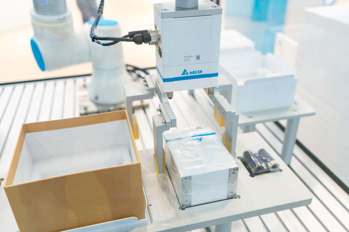 Delta’s Flexible Packaging Stacking Application demo integrates the multi-stroke Servo-electric Gripper RS-GPS Series, which can precisely control positioning, speed, and clamping force with status feedback.