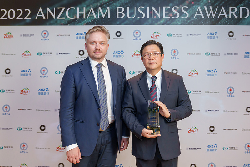 Mr. Victor Cheng (right), Delta’s Senior Vice President and General Manager of its Information & Communication Technology Business Group (ICTBG), accepted the 2022 Australia-Taiwan Business Partnership Award on behalf of the Company from Mr. Brent Moore (left), Deputy Representative and Senior Trade & Investment Commissioner of the Australian Office Taipei.