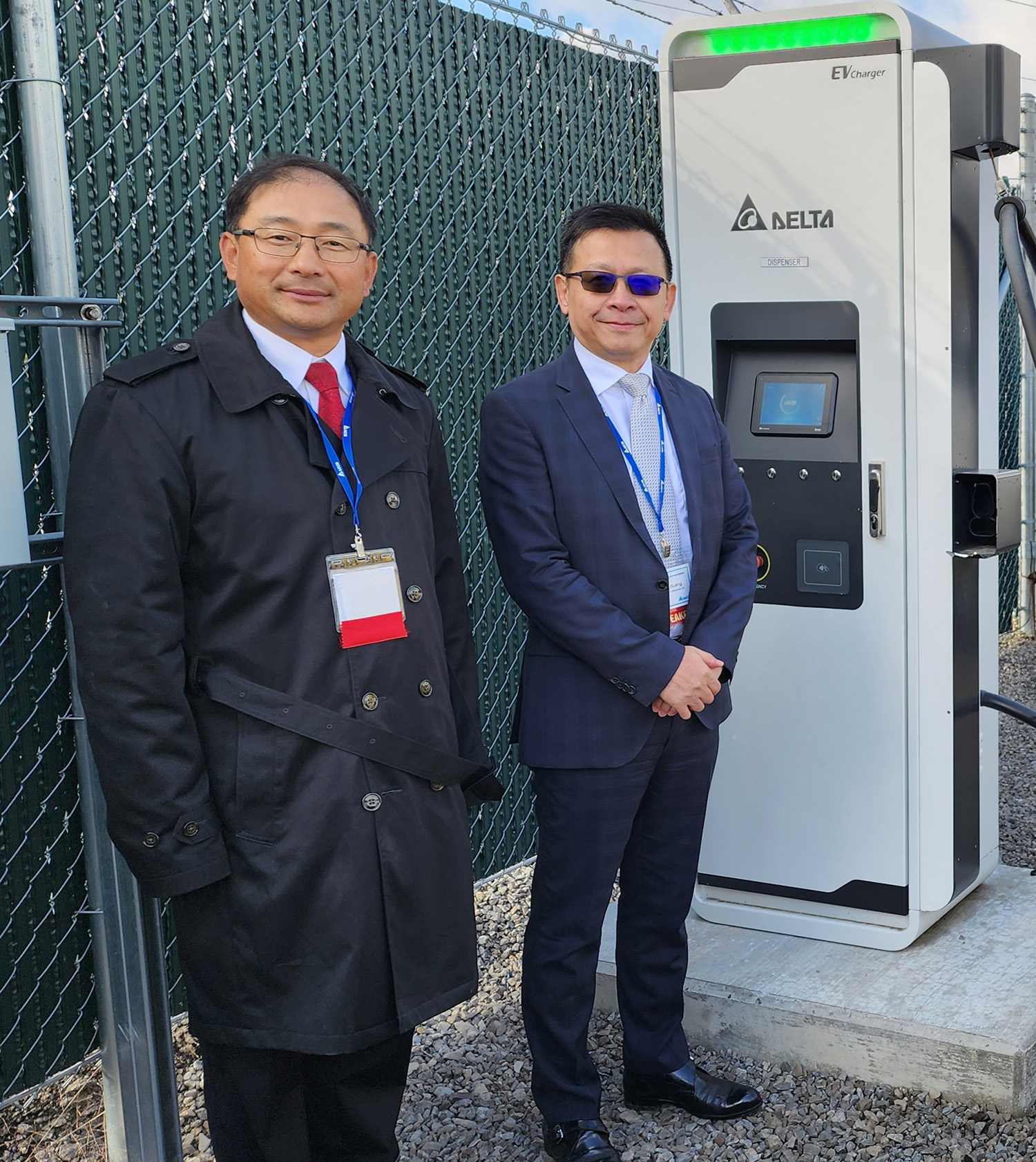 Delta Americas President Kelvin Huang (Right) and Automotive VP Charles Zhu demonstrated the 400kW Charger to partners.