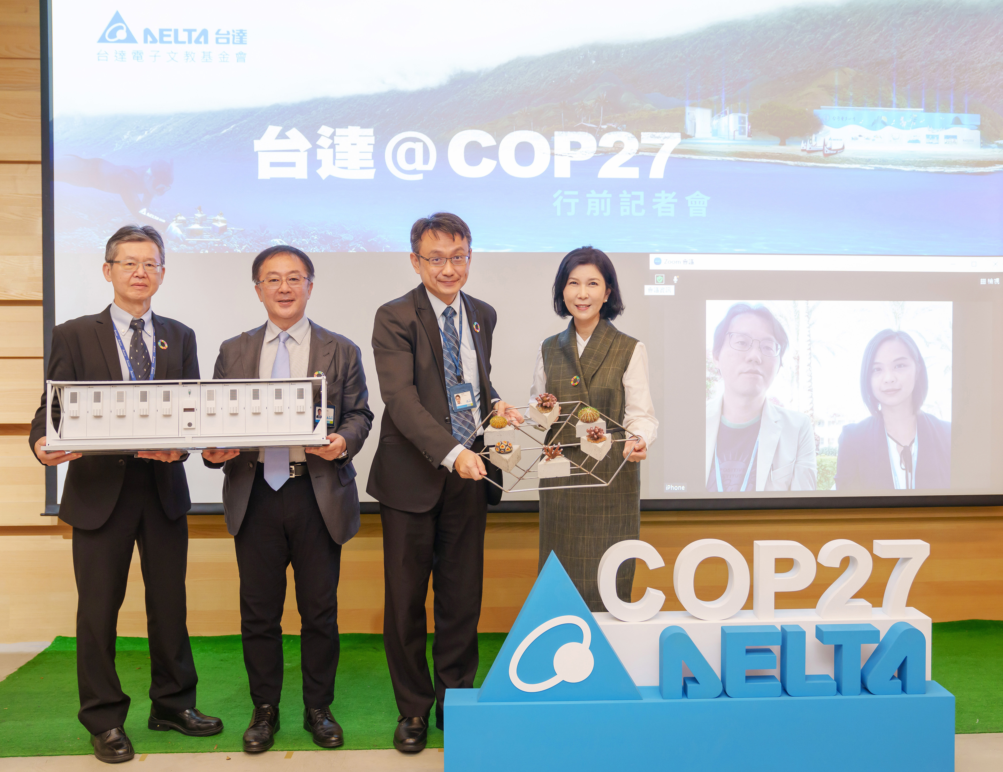 Ms. Shan Shan Guo, vice chairperson of the Delta Electronics Foundation (1st from right); Mr. Jesse Chou, Delta’s chief sustainability officer (2nd from left); Mr. Paul Ai, senior director of Delta’s Energy Solutions Division (1st from left); and Mr. Wim Chang, CEO of the Delta Electronics Foundation hosted the press conference along with Delta colleagues currently attending COP27 in Egypt.