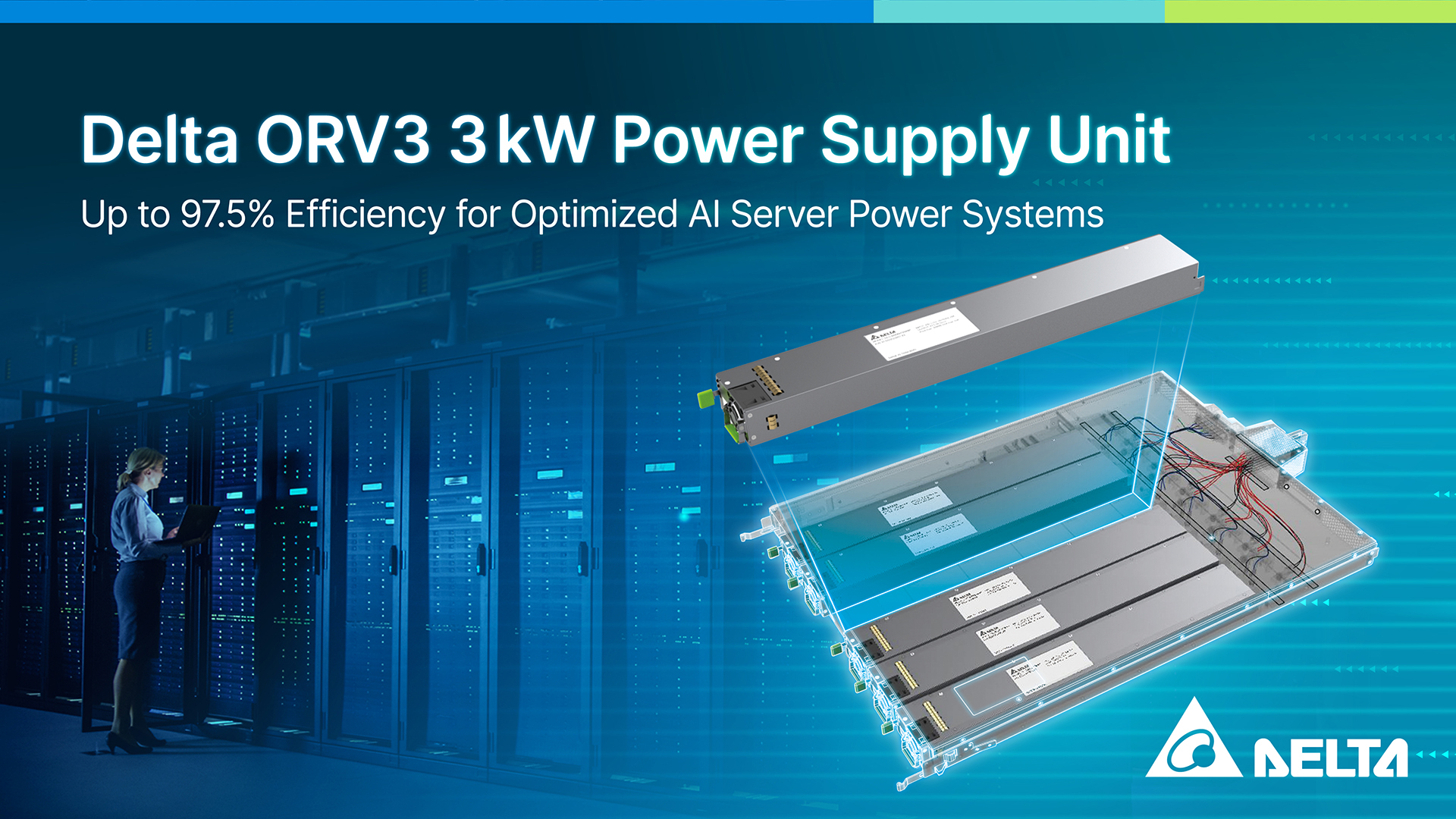 Delta ORV3 3kW Power Supply Unit delivers energy conservation with 97.5% efficiency.