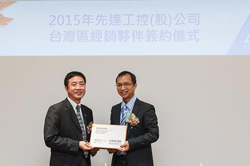 SYN-TEK Chairman Dr. David Tsai (right) presents a distribution authorization certificate to USE Electronics Assistant Manager Mr. Liao Ming-hwa Liao (left)