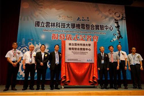 Delta IABG Assistant Manager Andy Liu (4th from the left), YunTech President Chuen-Kan Hou (4th from the right) and other guests unveil the “Electromechanical Integration Practice Center” at the opening ceremony