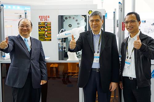 (From the left) Robotic Automation Business Dept. Director Peter Peng, Delta Group Chairman Yancey Hai, and the Industrial Motion System Business Unit General Manager David Tsai of the IABG are impressed with the Integrated IIoT, Automation and CNC Solution