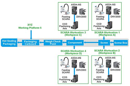 Delta’s screw sorting and packaging solution integrates the SCARA Robot and the Machine Vision System to achieve real-time and precise screw inspection and sealing
