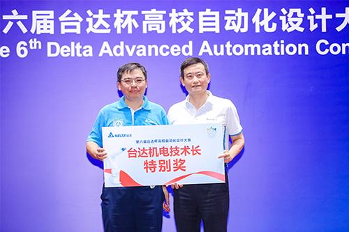 Professor Bai-yu Tseng from the Taipei University of Technology (left) has cooperated with Delta for a long time. He adopts Delta IA products in the classroom and has participated in the Delta Cup for 5 years. Chientan Lien (right), the CTO of the Delta Industrial Automation Business Group awards him with the “CTO Special Award” and presents a Delta Articulate Robot as gift.