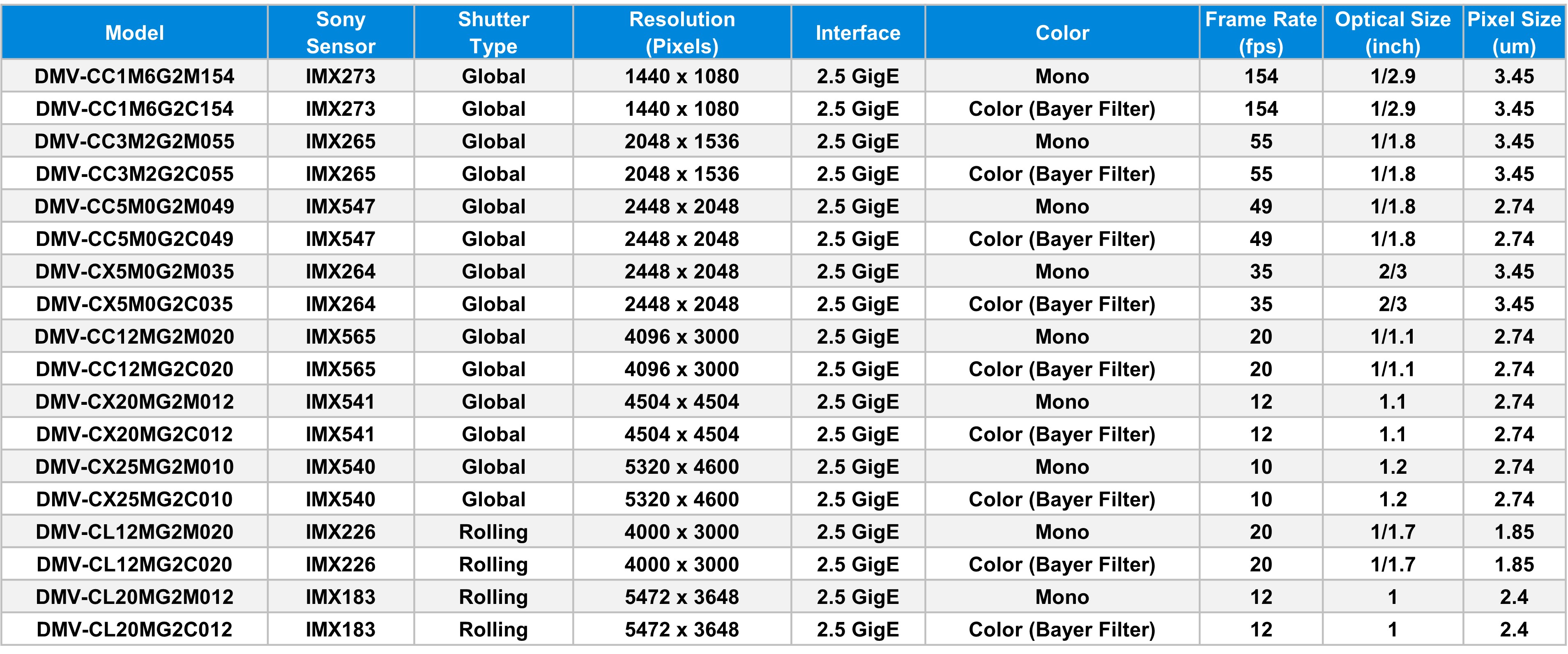 Built on an Ethernet-based architecture with a standard GigE interface, the DMV-C 2.5GigE Series is fully compatible with existing GigE networks, enabling seamless upgrades to 2.5 GigE and providing scalability for AI-driven and smart robotics applications.