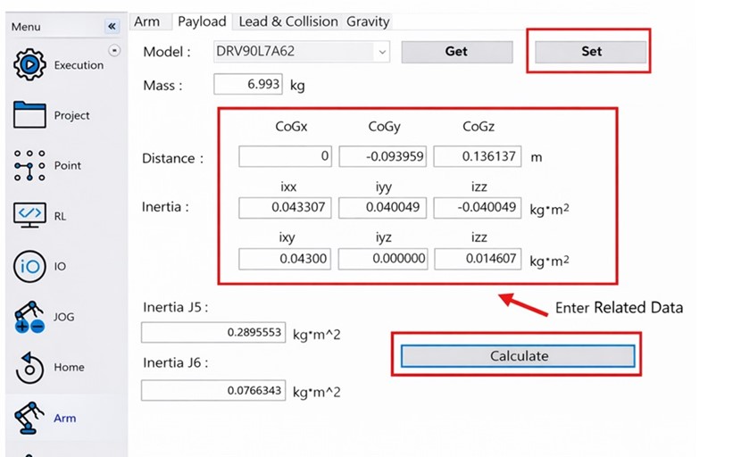 3. With the robot servo turned off, go to Arm in the left-hand menu, open the Payload page, enter the verified payload data, and click Calculate to confirm that the inertia values comply with the robot’s specifications.