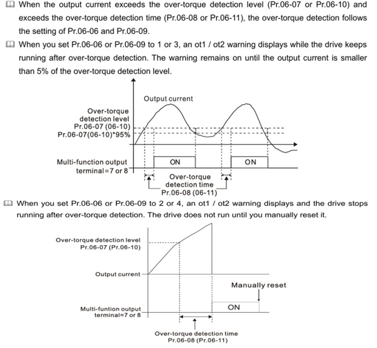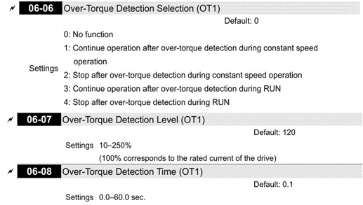 When a high-power motor drive is used to operate a low-power motor, excessive current may occur under certain operating conditions, potentially causing motor overheating and damages. It is therefore recommended to configure protection parameters that allow users to define appropriate thresholds. If the current exceeds the specified limit, the motor drive will trigger an alarm or fault notification, providing timely warnings and helping prevent motor failures.