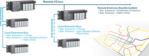 You can extend modules using the existing backplane. When additional backplanes are required, both local I/O extension and remote I/O extension are available. Remote I/O extension is available via DeviceNet. System Extension Structure