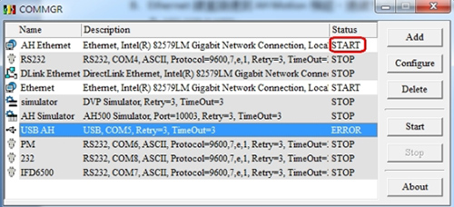 After finishing the setup for COMMGR, please remember to switch the status of the corresponded driver to start. The status will show “error” if the communication between computer and module is disconnected.