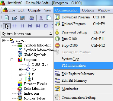 After finishing all the setup above, please select PM Information as a communication option in the PMSoft software. If all setups are correct, the module information of the AHPM or AHMC will appear. Users can then perform program uploads/downloads and online monitoring.