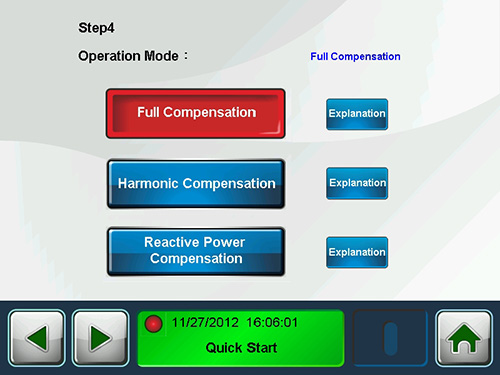 Yes. The APF2000 features both reactive power compensation and harmonic filtering. Users can choose to activate both functions simultaneously (Full Compensation) or independently (Harmonic Compensation/ Reactive Power Compensation). Select your desired operation mode on the HMI and the selected mode will turn to red. See the figure below.