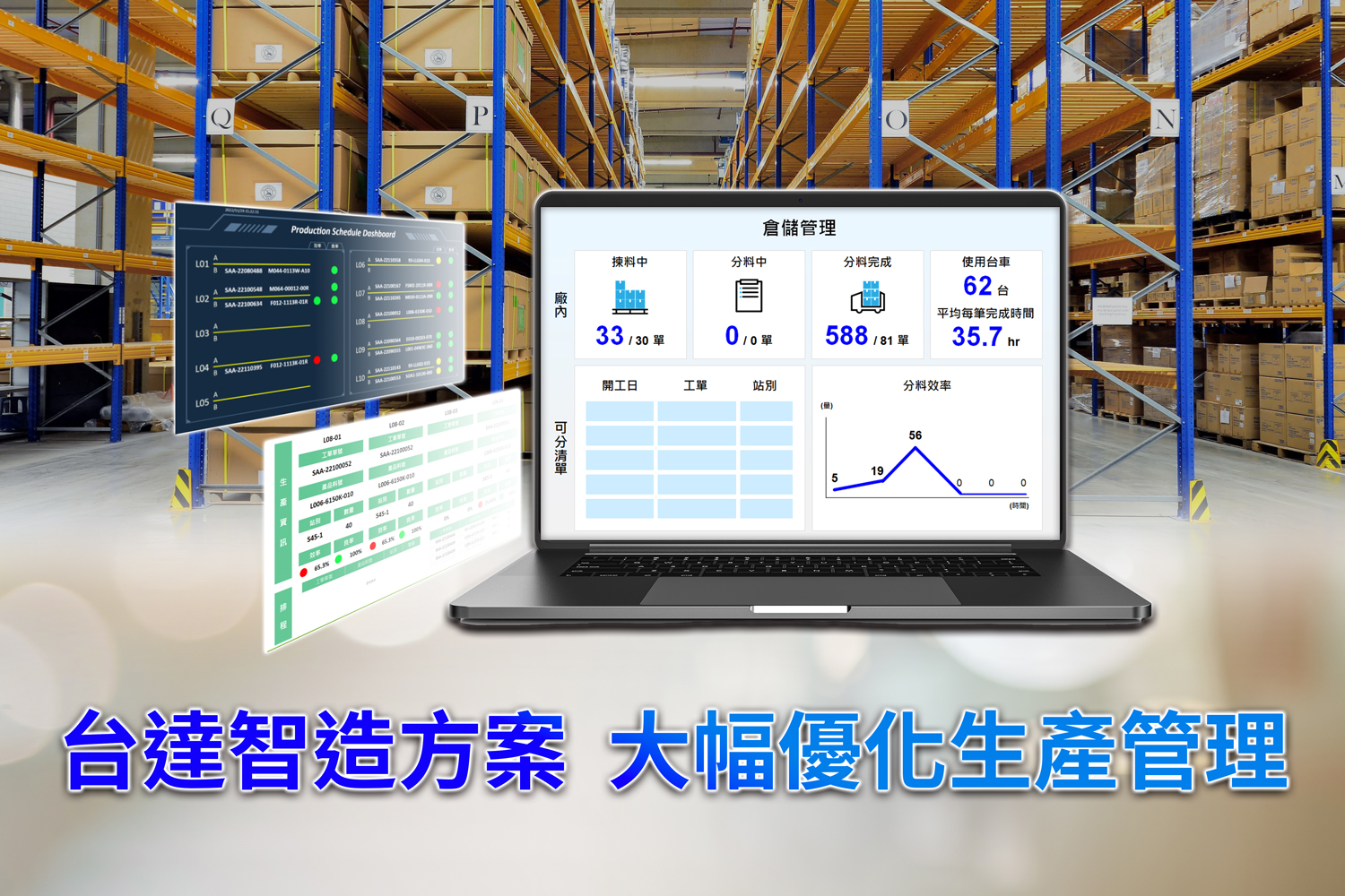 台達製造執行系統 DIAMES與倉儲管理系統 DIAWMS 整合產線與倉儲,監控人員、機台、物料即時數據,以便利的系統優化工廠生產管理。