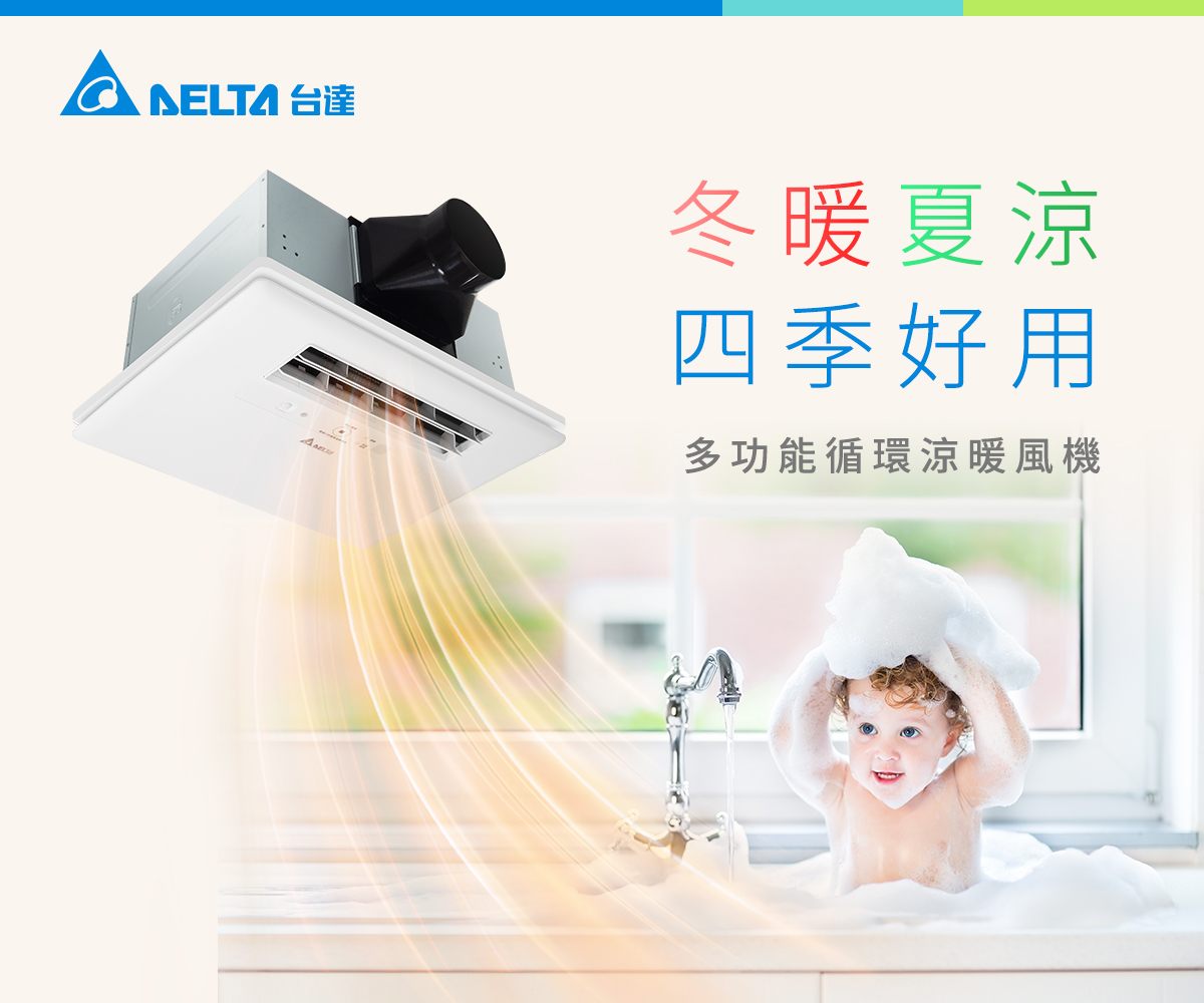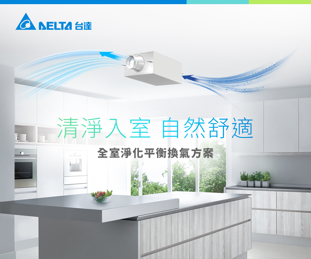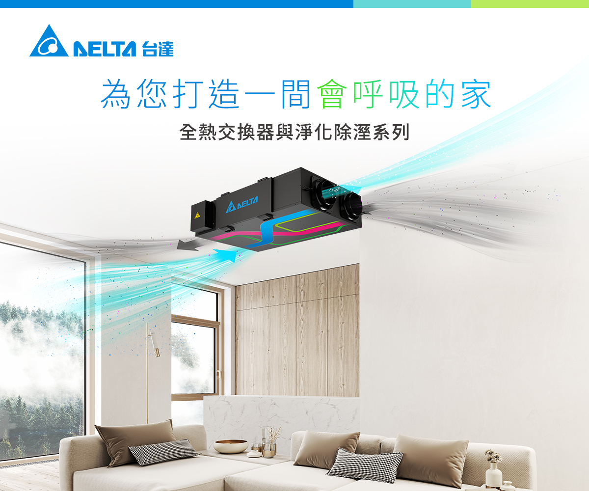 台達PM2.5直流變頻全熱交換器-內循環型,能引進過濾後的清淨新風,全屋換氣、全家健康;內建自動旁通模式與內循環功能,換氣快更節能;超薄型機身設計,解決室內安裝高度不足的問題;全系列採節能DC變頻馬達、高效三重濾網,有效過濾室外空汙霧霾有害的PM2.5,淨化效果高達97%;可搭配智慧控制面板,自動監測室內空氣品質(PM2.5, CO2)並智慧調整至所需的換氣量;便利檢修蓋設計,定期維護好方便。內建高效率石墨烯熱交換芯,具備卓越的導熱性能與抗菌防霉特性,與普通熱交換芯相比,能顯著提升能量回收效率。