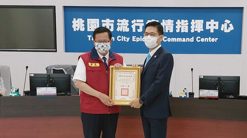 台達響應桃園市幼教與特教場所空氣品質改善示範計畫,由樓宇自動化事業部總經理江文興(右)代表接受桃園市市長鄭文燦(左)頒發的感謝狀。