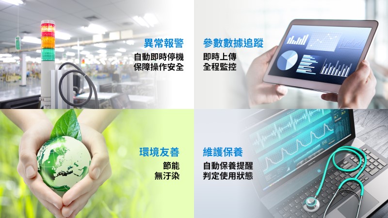台達伺服壓床擁有完善的製程追蹤方案,可量化數據,協助管理者根據運作狀態排定維修時間,幫助提升產能,降低不良率。