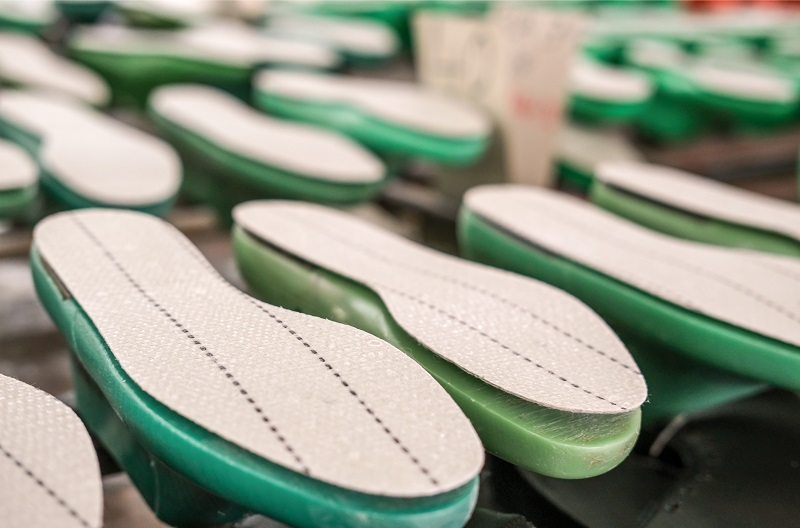鞋底製程工序始於鞋子本體架至上模具,模站熱盤加熱後,將熔融的發泡橡膠材料澆鑄至下方鞋底的模具中,經上下合模及發泡膨脹,完整包覆產品,加以冷卻成型後即完成鞋子的製作。