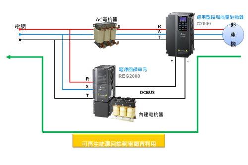 圖三:台達起重系統採用REG2000取代煞車電阻,當主電源進入C2000系列供系統運作時,系統會將天車煞車、起動或移動時產生的位能傳送到REG2000,轉換為再生電力並回傳到電網中再使用,達到節能效果