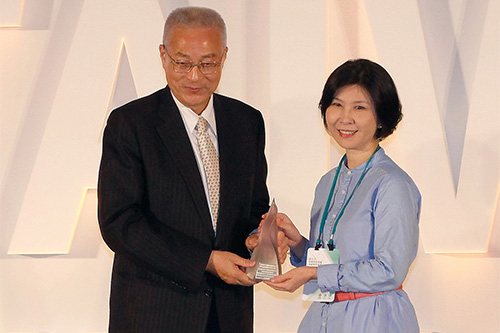 台達品牌長郭珊珊女士(右)從吳敦義副總統手中領取2014「台灣精品銀質獎」。