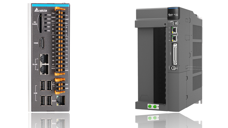台達薄膜塗布機應用套裝方案整合多項台達產品,建構以 PC-Based 高階運動控制器AX-8系列 (左) 為核心的控制系統。高階伺服系統A3-ET (右),快速精準控制薄膜張力。