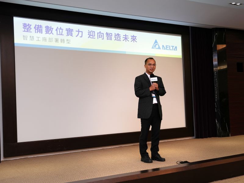 台達智能解決方案新事業發展部系統整合副理陳裕任於台南場活動,為現場來賓說明台達軟硬整合智造方案特色。