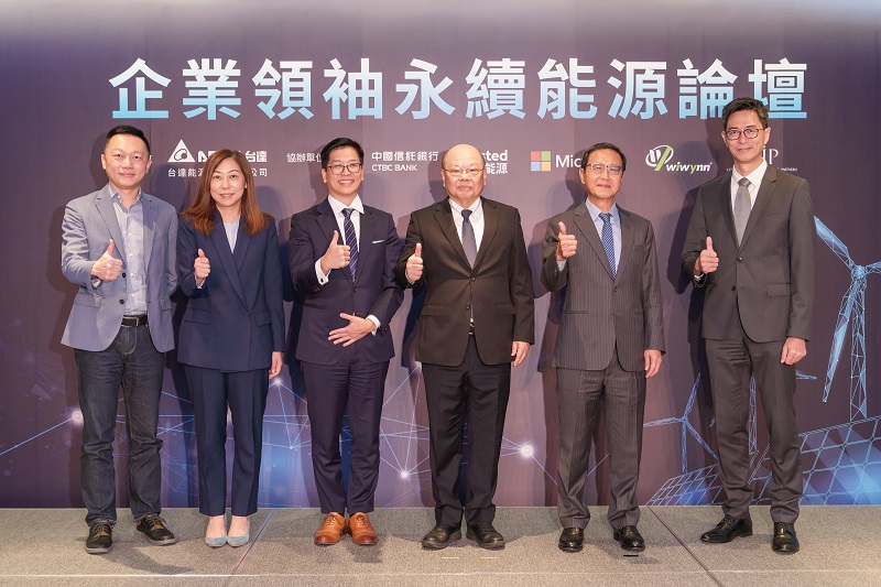 台達能源宣佈正式取得再生能源售電業執照,台達電子副董事長柯子興(右三)、台達能源總經理張立業(左三)以及各領域合作夥伴(左起)台灣微軟專家技術部總經理吳子強、沃旭台灣董事長汪欣潔、中信金控總經理陳佳文、緯穎科技永續長陳昌偉合影。