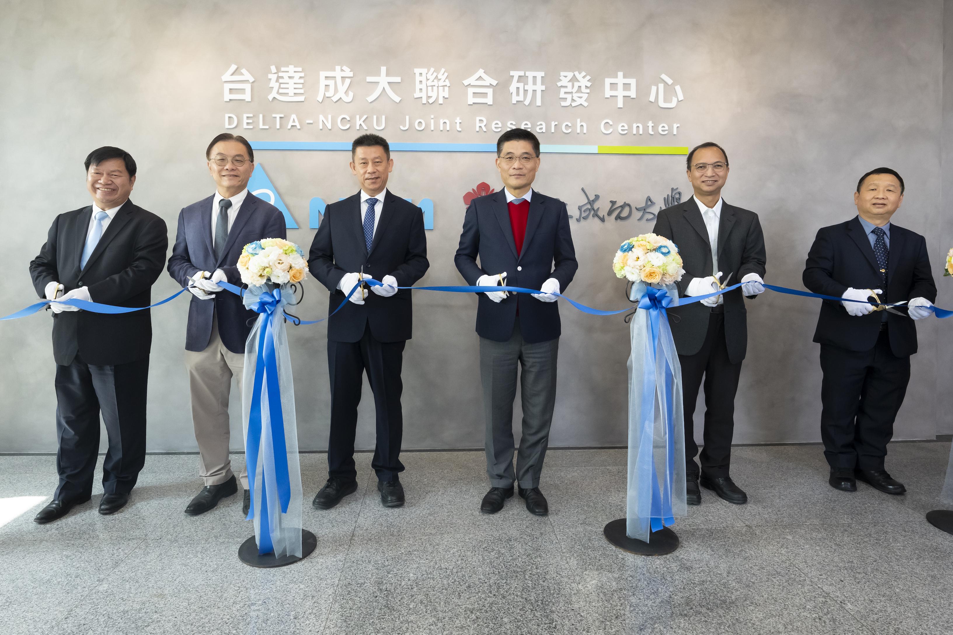 台達執行長鄭平(左三)、成大校長沈孟儒(左四)、台達資通訊基礎設施事業群技術長蔡文蔭(左一)、台達機電事業群副總經理蔡清雄(右二)、成大副校長莊偉哲(左二)及台達成大聯合研發中心主任梁從主(右一)為台達成大聯合研發中心揭牌進行剪綵。