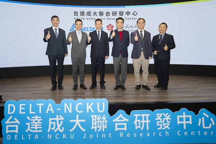 左至右:台達能源基礎設施暨工業解決方案事業群總經理李延庭、台達資通訊基礎設施事業群總經理黃彥文、台達執行長鄭平、成大校長沈孟儒、成大副校長莊偉哲、台達成大聯合研發中心主任梁從主共同出席揭牌典禮。