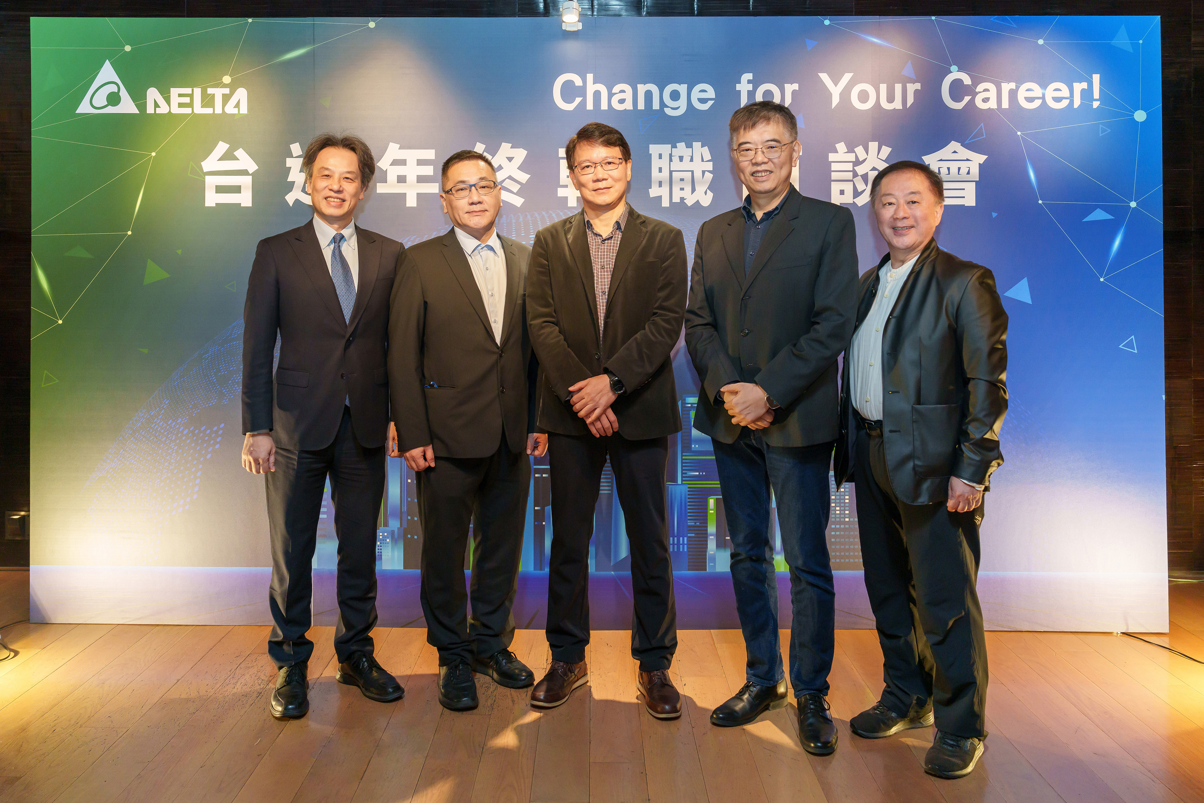 台達全球事業營運執行副總裁尹鏇博(右二)、交通範疇執行副總裁唐修平(右三)、台灣製造總經理賴秋元(左二)、人資長陳啟禎(左一)、永續長周志宏(右一)親自出席台達年終轉職面談會分享產業趨勢及台達發展。