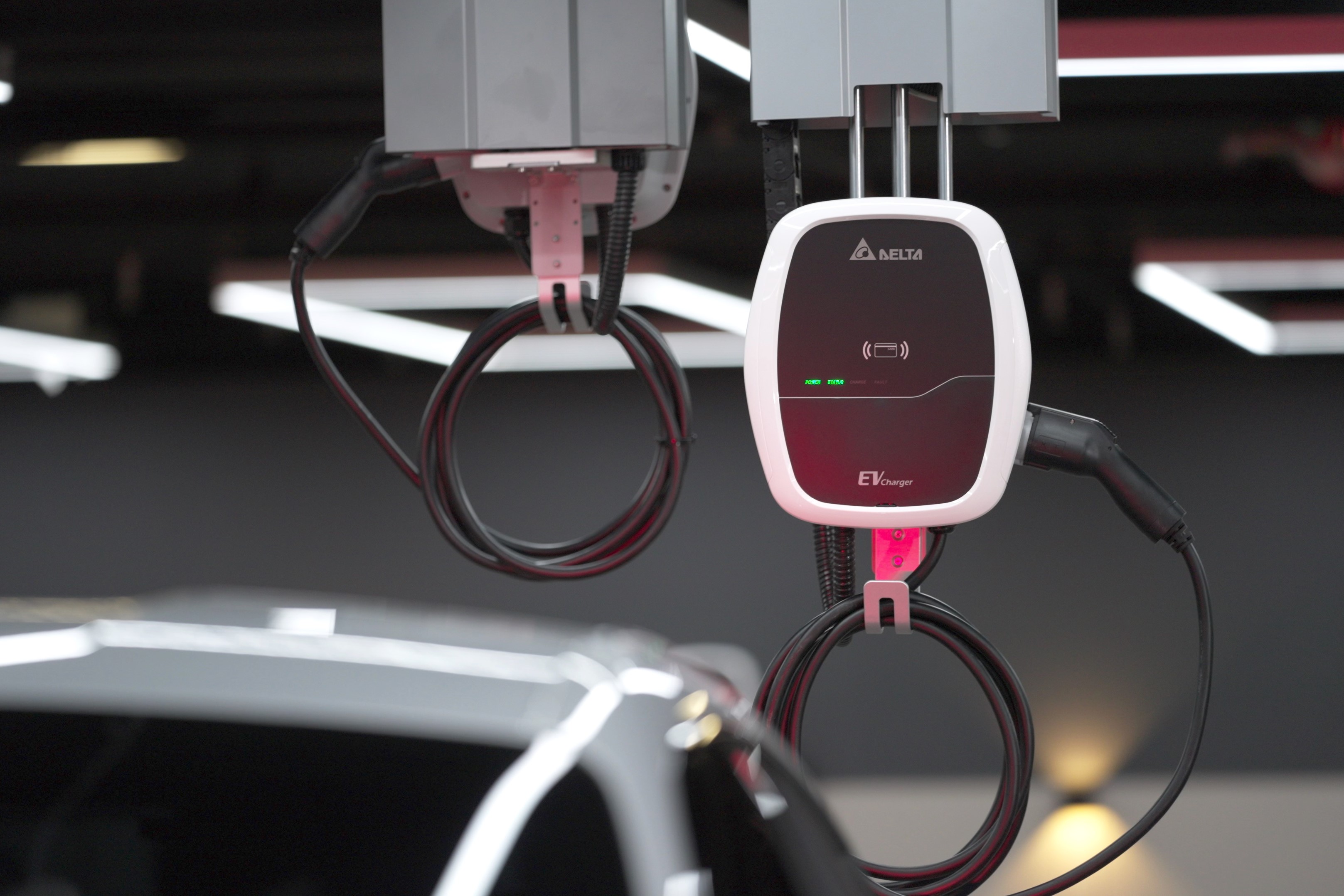 整層共79座的充電樁在DeltaGrid® EVM電動車充電管理系統調度下可以同步充電。