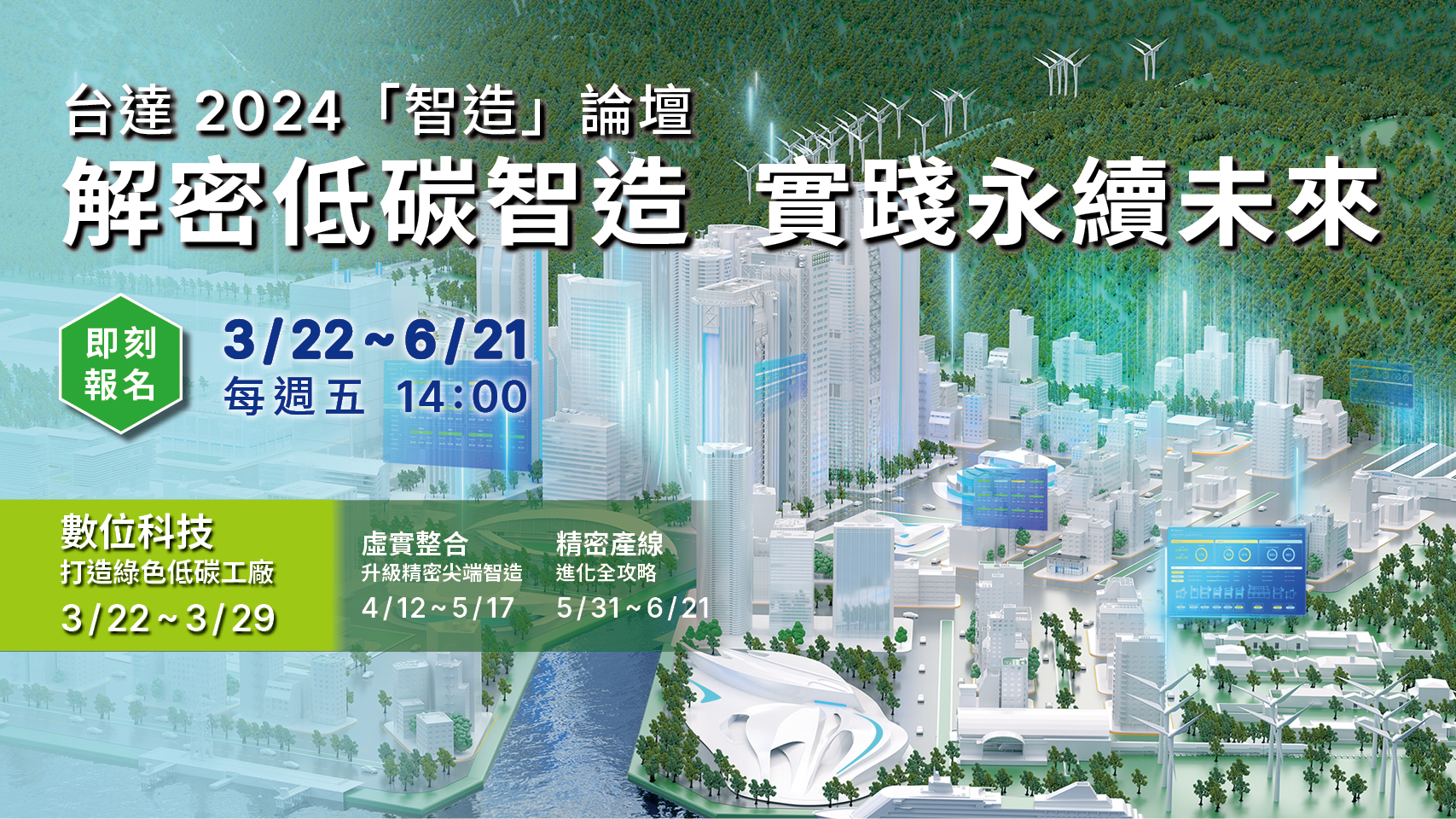 即刻報名台達「智造」線上論壇,3/22 起,每週五下午 2 點鎖定直播,邀您一同踏出轉型綠色智慧工廠的第一步,邁向低碳永續願景。