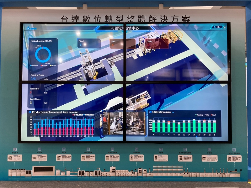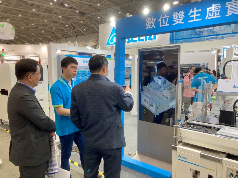 台達數位雙生虛實整合解決方案,展出虛擬與實體機台無縫整合,好奇來賓紛紛駐足參觀。