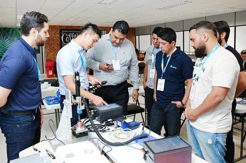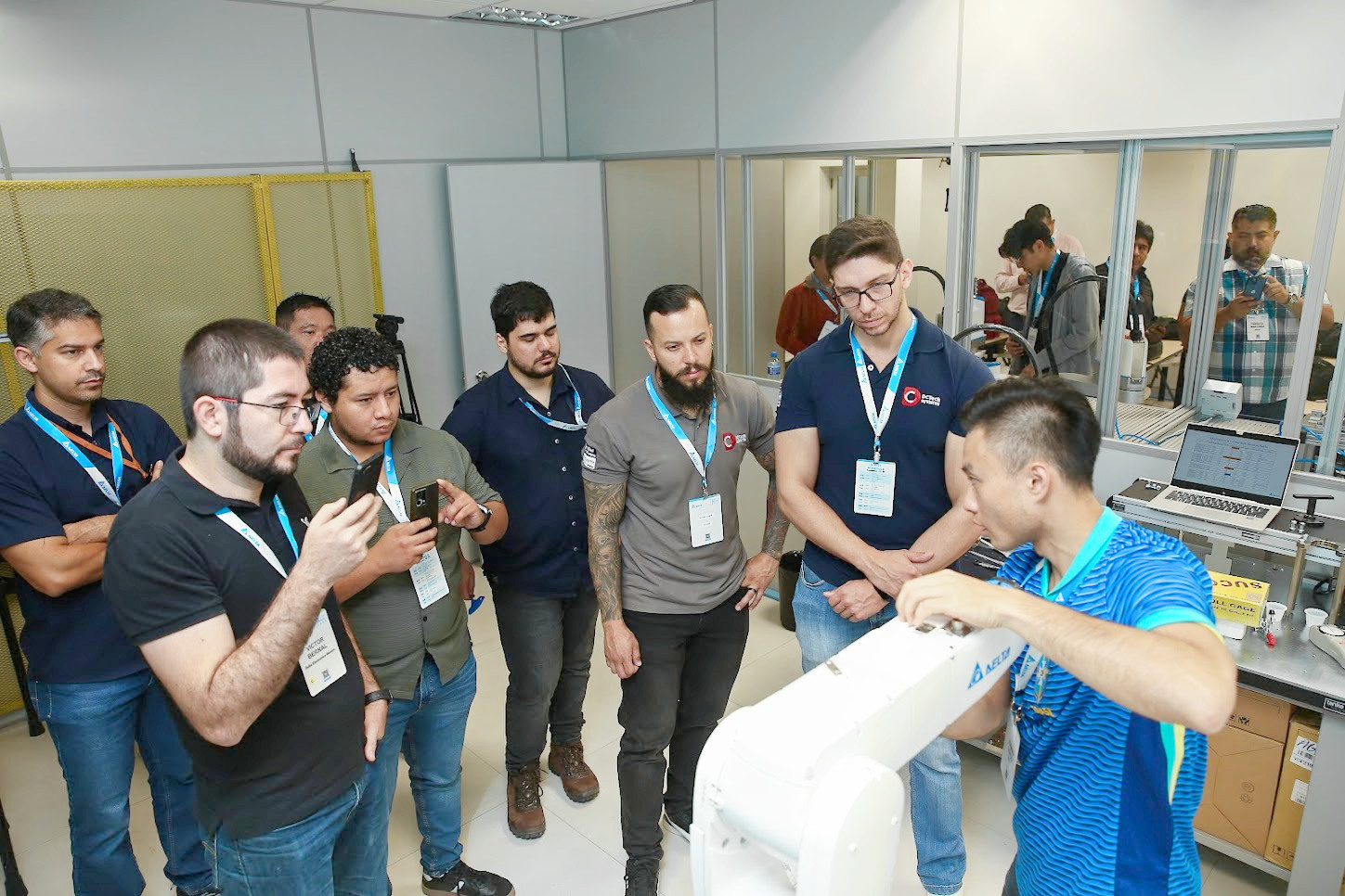 台達講師手把手教學智能螺絲鎖附系統,學員們包含巴西及墨西哥分公司 FAE 工程師、巴西 ASP 等。