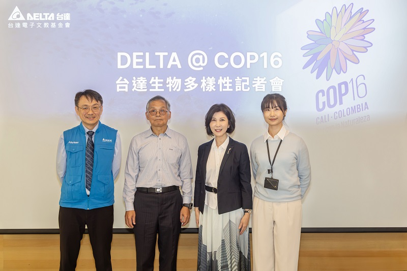 台達舉辦COP16返台成果記者會,由台達品牌長暨台達基金會副董事長郭珊珊(右2)、「台達孕生珊瑚復育計畫」總顧問戴昌鳳教授(左2)、台達基金會執行長張楊乾(左1)和台達企業永續發展部經理楊曼瑜出席分享。