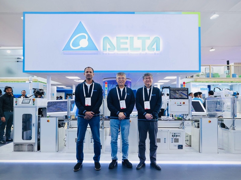 台達印度子公司總經理Niranjan Nayak先生(左)、台達全球事業營運執行副總裁尹鏇博先生(中)和台達印度區總裁林正彬先生(右)在印度ELECRAMA 2025展會中合影