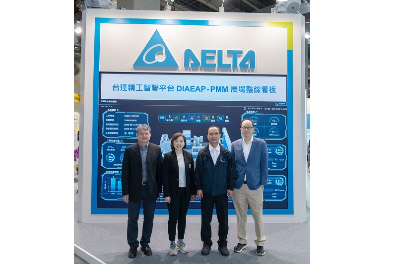 台達機電事業群副總經理蔡清雄(右二)、行業系統方案部處長陳廷璋(左一)、行銷經理胡嘉平(左二)及驅動產品事業部經理邢雷鍾於2025台北國際工具機機展台達展位前合影。