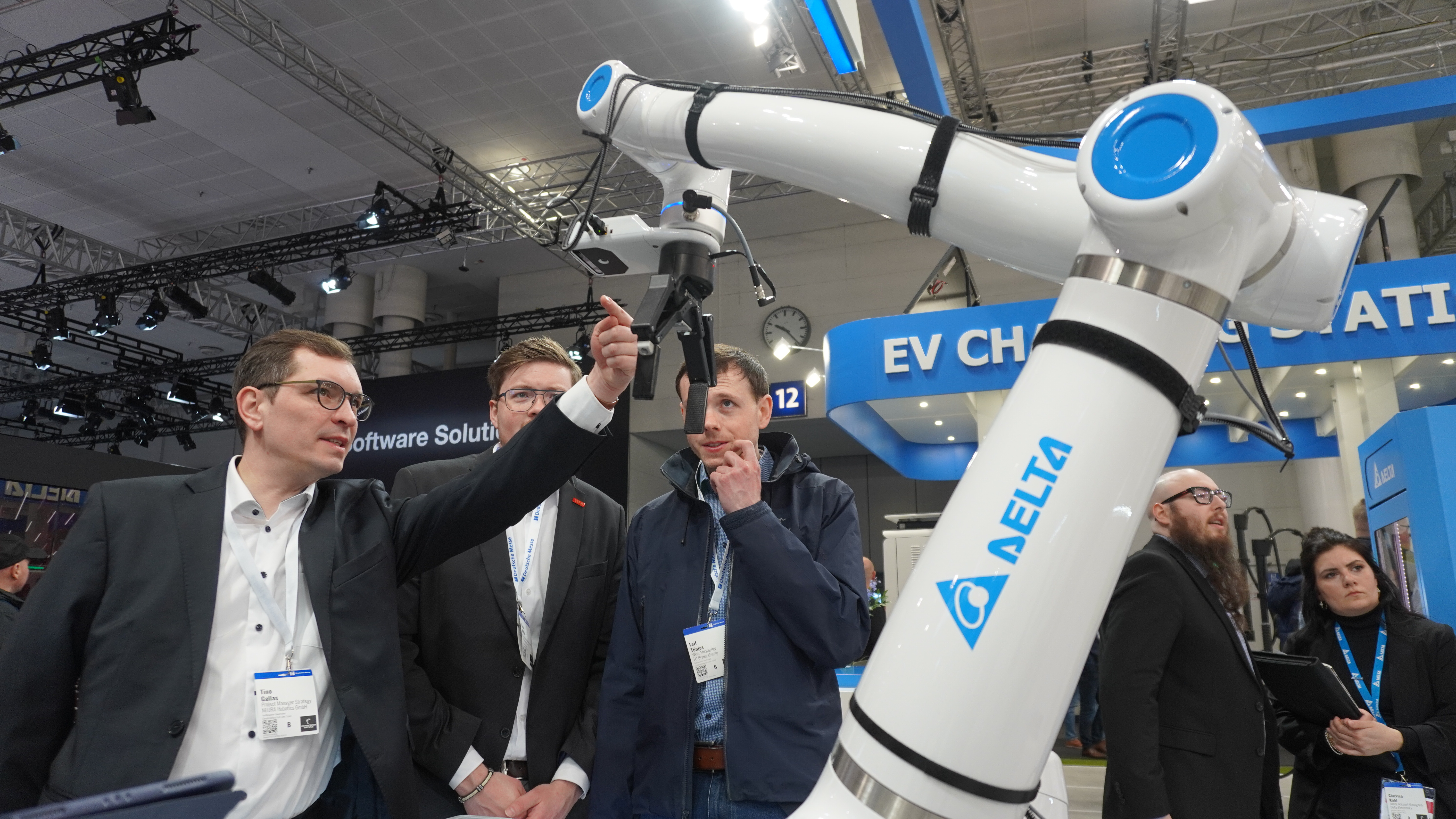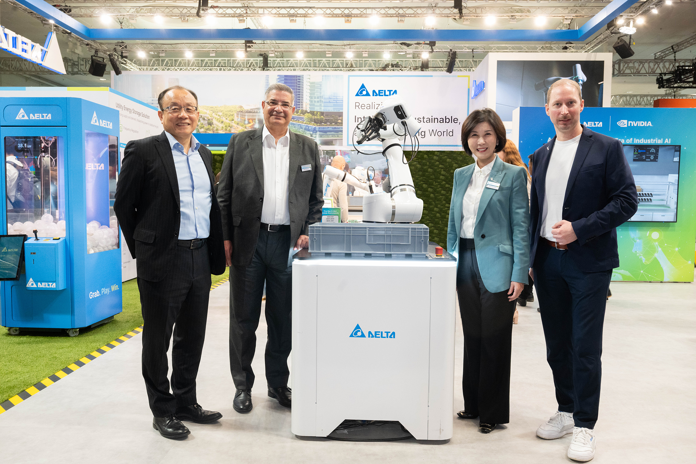 台達品牌長郭珊珊 (右二)、台達 EMEA 區總裁暨總經理 Dalip Sharma (左二)、台達 EMEA 區副總裁 Tim Lee (左一)及台達機電事業群 EMEA 區資深業務處長 Michael Mayer-Rosa (右一) 於漢諾威展上向媒體和客戶介紹台達 D-Bot 系列協作機器人及首度推出的 Cognibot Kit,展示相關 AI 應用。