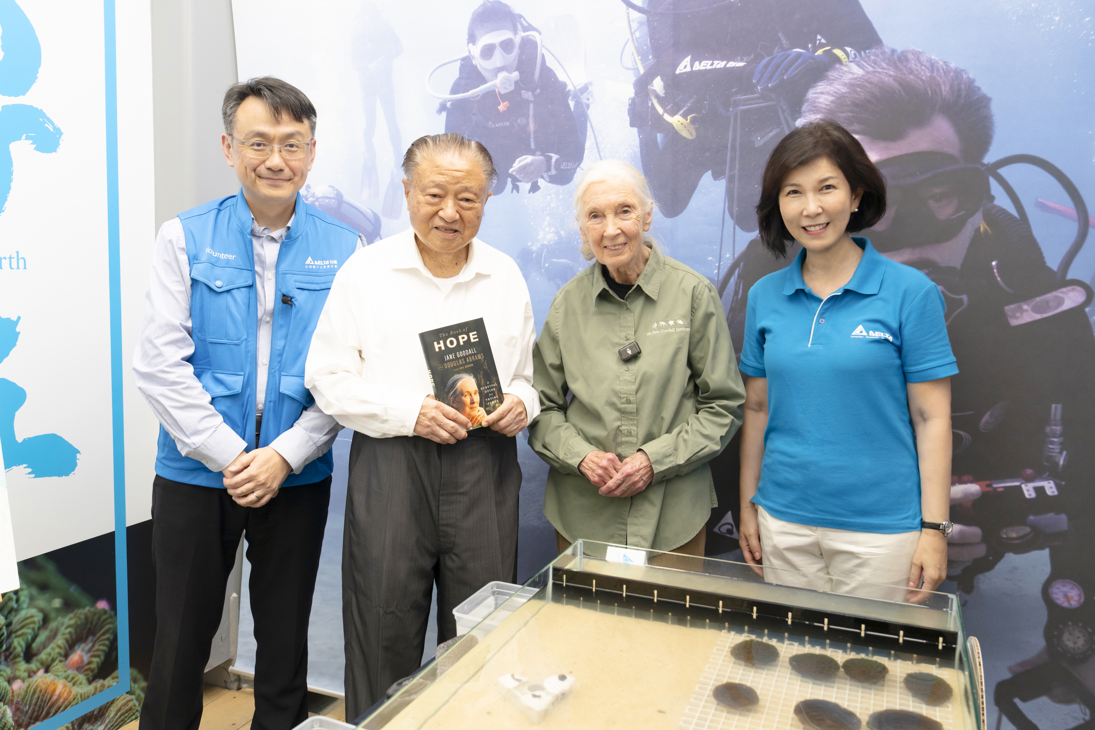 珍古德博士(右2)致贈親筆簽名書《The Book of Hope》給台達創辦人鄭崇華(左2),並與台達基金會副董事長郭珊珊(右1)及台達基金會執行長張楊乾合影。