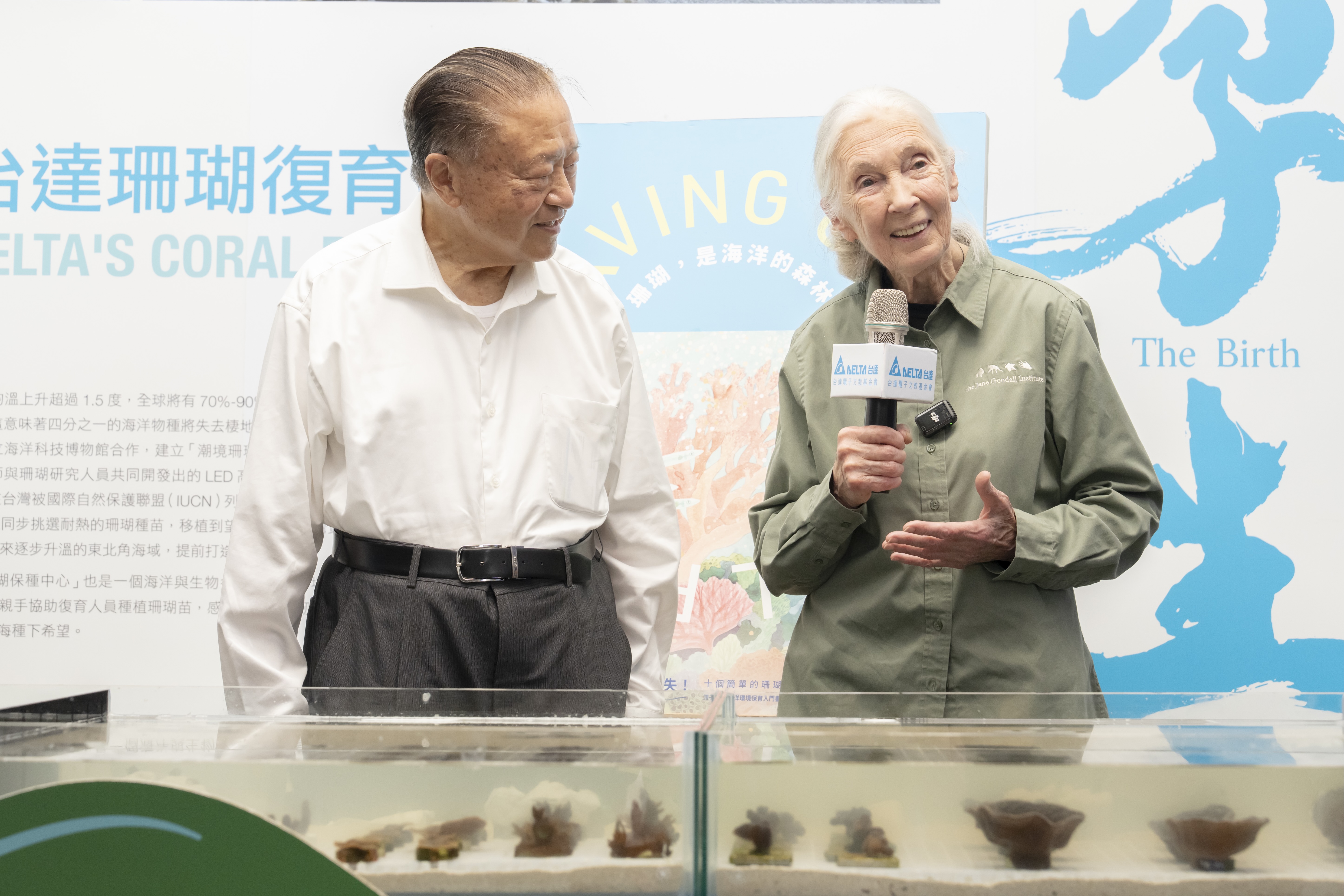 台達創辦人鄭崇華(右)偕同珍古德博士參觀潮境珊瑚保種中心。