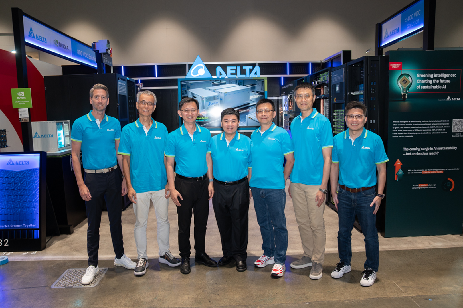 台達參與2025 OCP全球峰會,台達電源及零組件事業群執行副總裁史文景(左2)、電源及系統事業群副總裁暨總經理陳盈源(左3)、美洲區總經理曾百全(左4)、資通訊基礎設施事業群副總裁暨總經理黃彥文(右3)和風扇暨熱傳導事業群總經理蔡明熹(右2)等主管於台達展位合影。