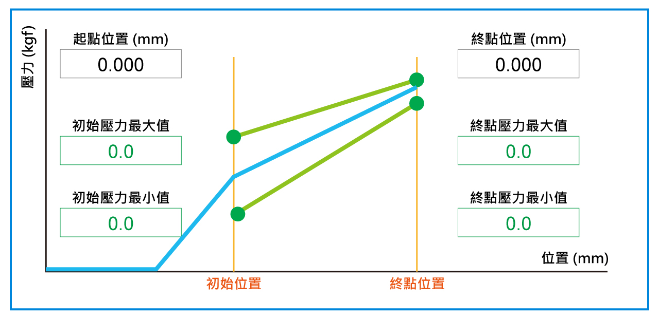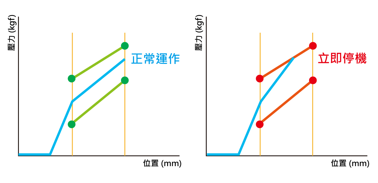 曲線監控功能在偵測超出峰值時,可立即停機,防範錯誤流入後段工序。