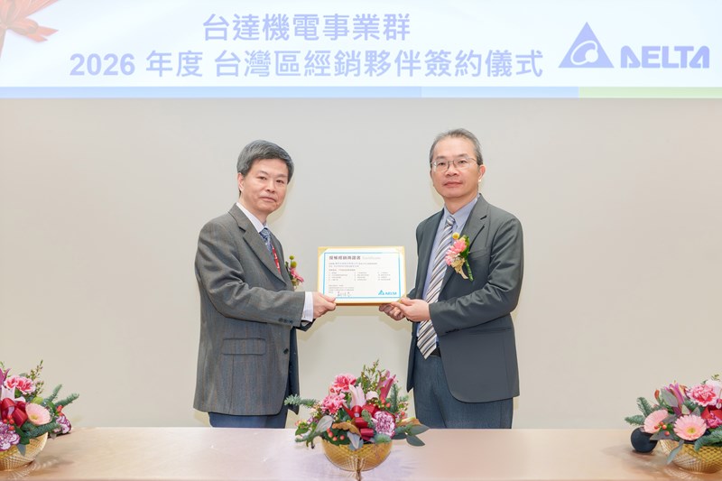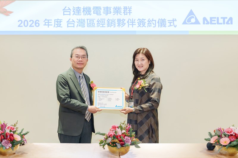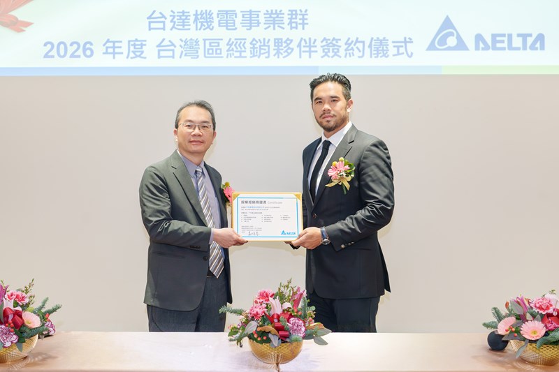 台達機電事業群劉佳容總經理 (左)、碁電沈睿誠執行長 (右) 授證合照。