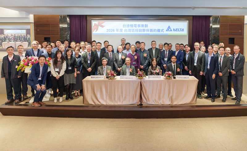 「2026年台灣經銷商簽約儀式」簽約代表:(左起) 羅昇李長堅總經理、台達機電事業群劉佳容總經理、友士加藤純子董事長、中和碁電沈睿誠執行長。